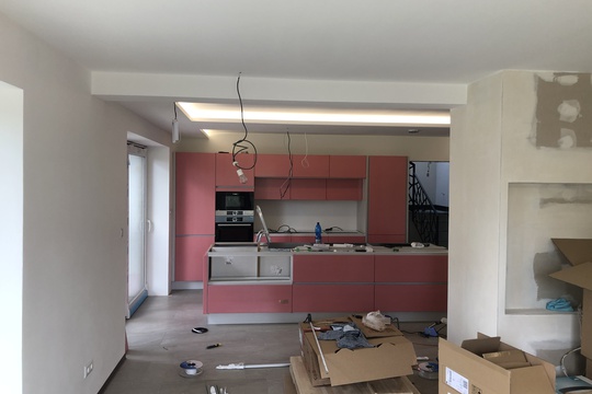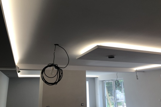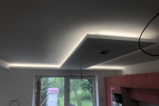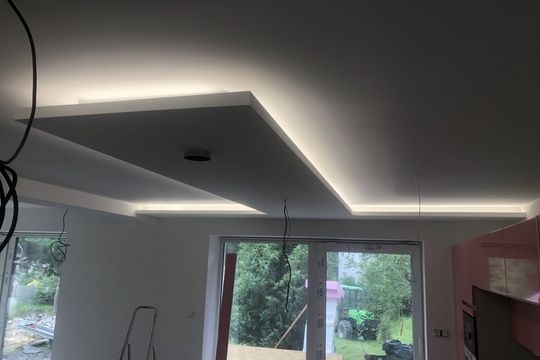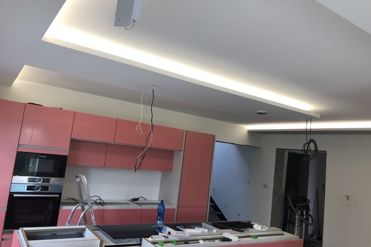 V naší další montáži Vám ukážeme přiklad osvětlení sníženého podhledu v obývacím pokoji a kuchyňské lince. Majitelé domu potřebovali do rekonstruovaného domu zabudovat rekuperaci vzduchu, a tak vymysleli toto šikovné snížení, které se rozhodli doplnit o LED pásky. Podhledy jsou rozděleny na dva okruhy (kuchyňský kout a obývací pokoj), každý okruh je ovládán zvlášť jedním ovladačem, díky kterému si můžete volit intenzitu osvětlení podle nálady.