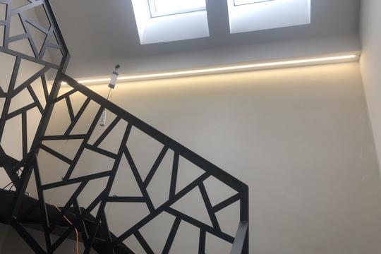 Dále se prováděla montáž osvětlení schodiště. Z důvodu použití nízkého profilu jsme použili LED pásek s řady PROFI 240LED/m, který nedělá ani v nízkém profilu světelné body a světlo je tak homogenní.