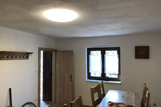 Dále se montovali svítidla do technických místností, WC, venkovní osvětelní, osvětlení světnice, osvětlení kuchyňského koutu, chodby, a osvětlení jídelny. Pro osvětlení světnice jsme použili svítidlo řady Diamant, které má výkon 50W a je možno ovladačem regulovat jas a teplotu světla od 3000 K až do 6000 K. Pro další osvětlení byly zvoleny LED panely.