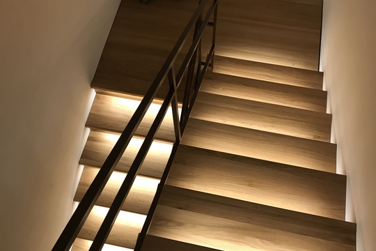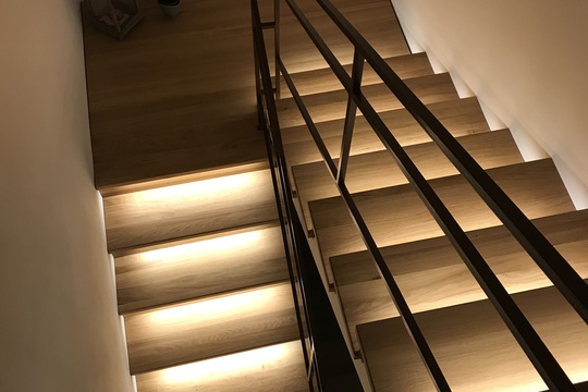 Osvětlení jednotlivých stupňů schodiště. Je provedeno pomocí zápustné lišty GROOVE10, do níž je uložen pásek z řady PROFI o výkonu 4,8W/m. Schodiště je vybaveno pohybovými čidly a stmívačem, který po 9 hodině večer utlumí výkon schodiště na polovoční výkon, aby nedocházelo k oslnění, když jdete v noci například na toaletu. Pohybové čidlo je umístěno z obou stran schodiště, tak aby zapínalo vždy, když na schodiště vstoupíte.