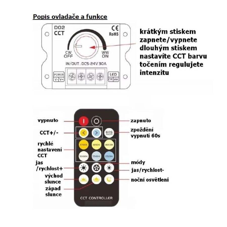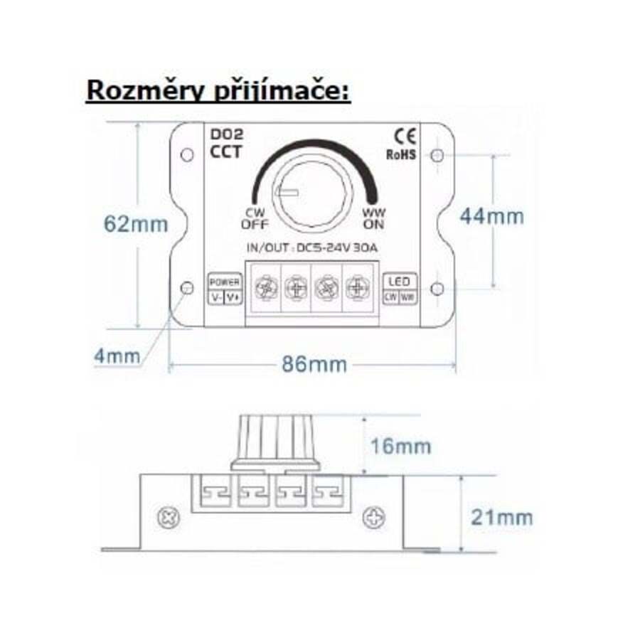 Stmívač a vypínač 1kanálový RF (radiofrekvenční) s dálkovým a manuálním ovládáním intensity jasu CCT LED pásků a CCT LED modulů. Přijímač může být ukrytý (za zdí, sádrokartónem či ve skříni), není nutná přímá viditelnost přijímače pro ovladač. LED ovladač RFM umožňuje ovládat 1 zónu samostatně. Světlo můžete ovládat jak dálkovým ovladačem, tak manuálně kolečkem na přijímači.