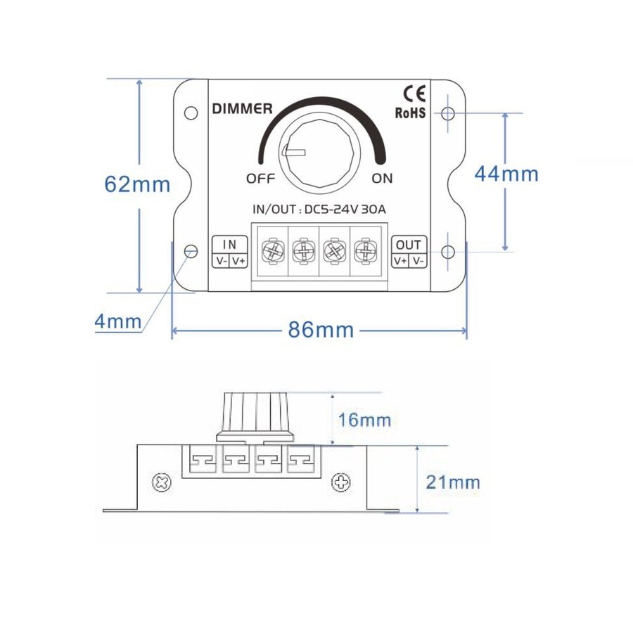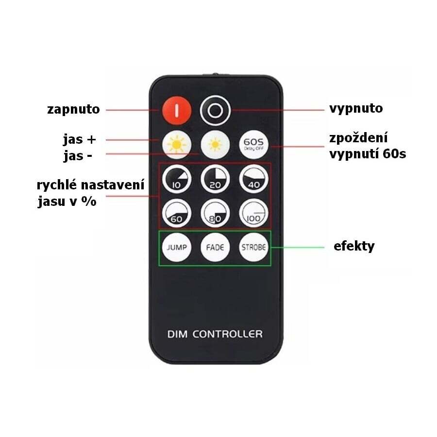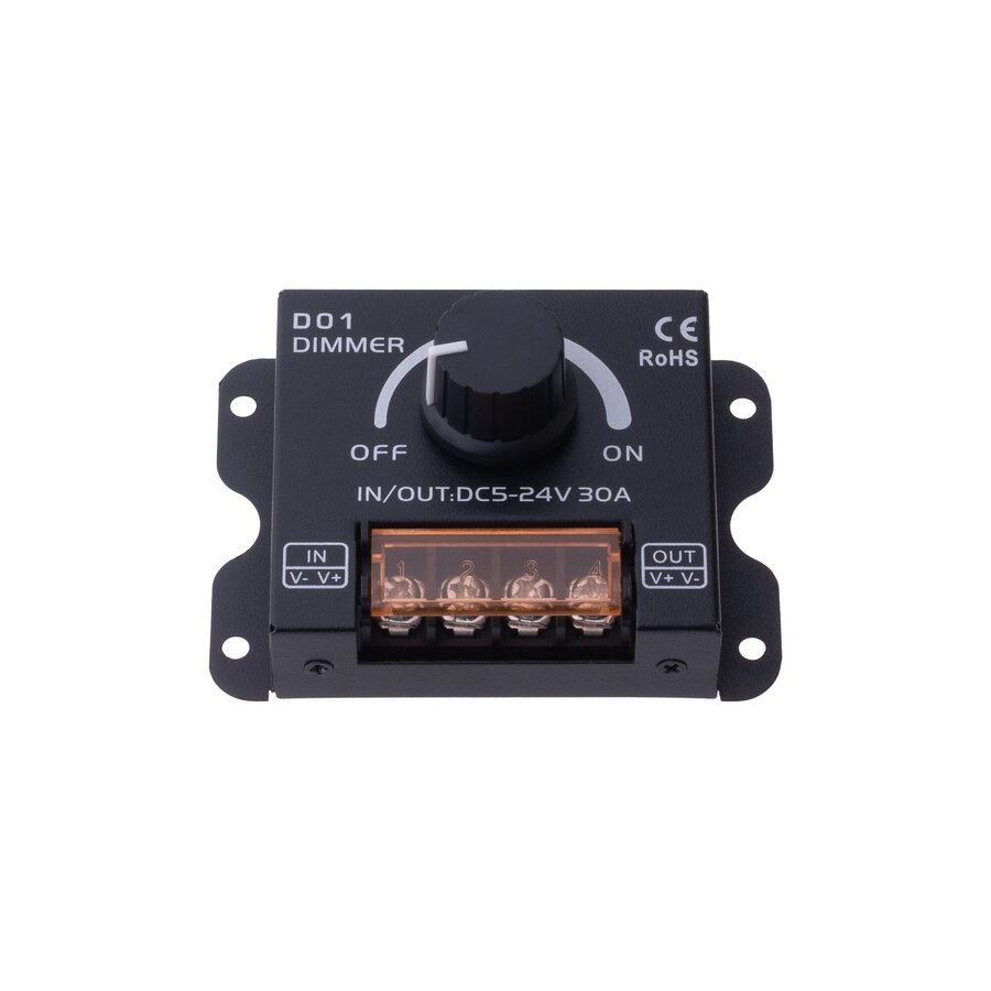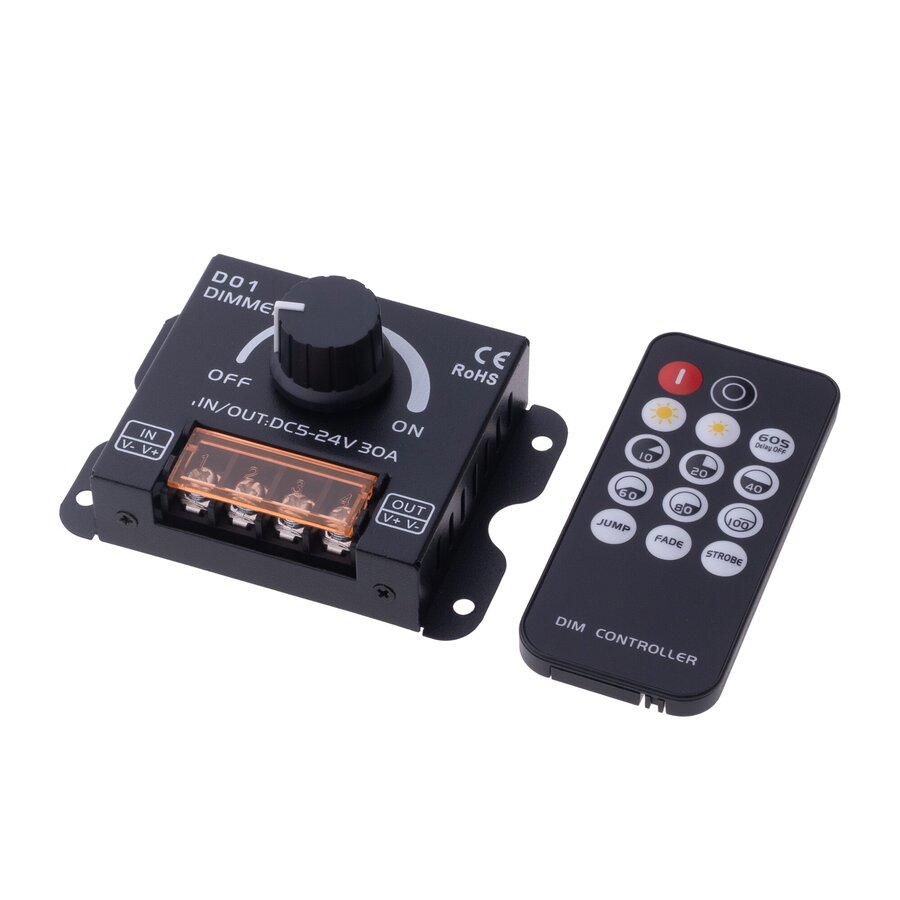 Stmívač a vypínač 1kanálový RF (radiofrekvenční) s dálkovým a manuálním ovládáním intensity jasu jednobarevných LED pásků, stmívatelných LED žárovek 5-24V a jednobarevných modulů. Přijímač může být ukrytý (za zdí, sádrokartónem či ve skříni), není nutná přímá viditelnost přijímače pro ovladač. LED ovladač RFM umožňuje ovládat 1 zónu samostatně. Světlo můžete ovládat jak dálkovým ovladačem, tak manuálně kolečkem na přijímači.