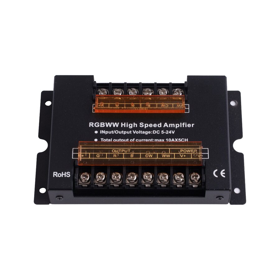 Zesilovač pětikanálový RGBCCT signálu RGBCCT LED produktů. Slouží k rozšíření výkonů LED ovladačů nad jejich přípustné zatížení. Například k ovladači s max. zatížením 72W připojením zesilovače přidáte další úsek o 600W. Pozor, hodnoty se nesčítají.