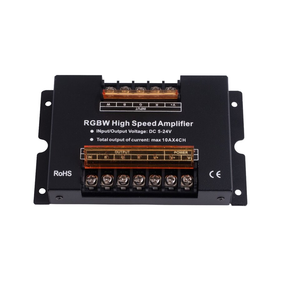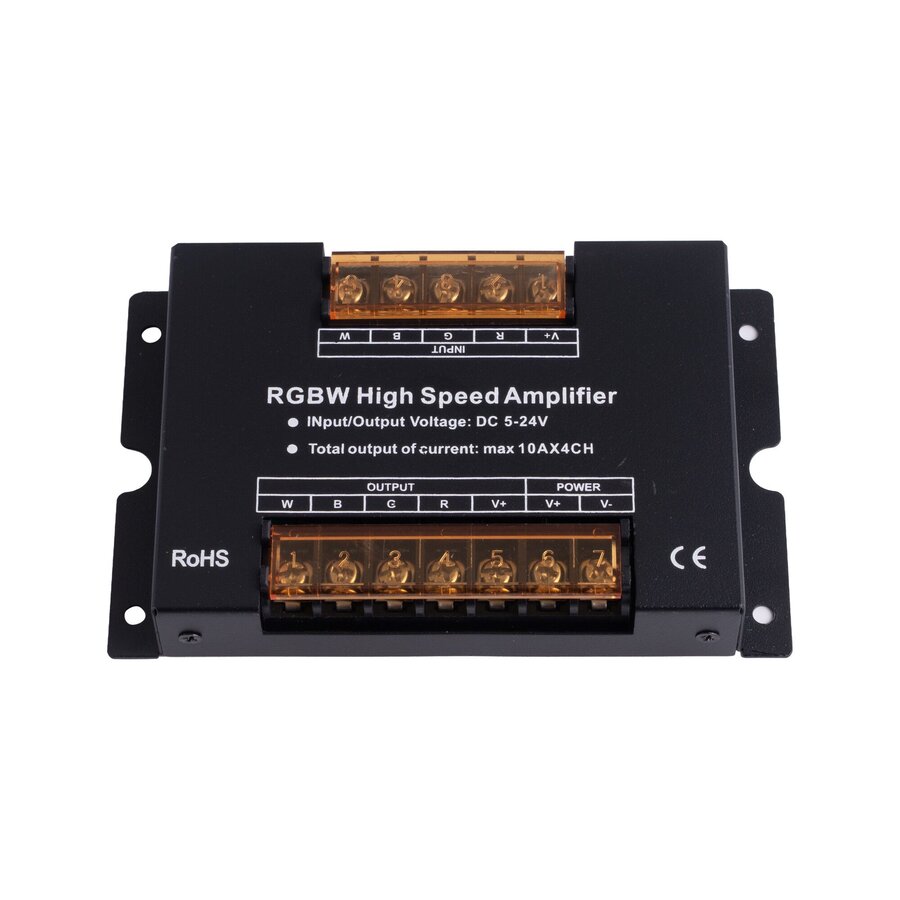 Zesilovač čtyřkanálový RGBW signálu RGBW LED produktů. Slouží k rozšíření výkonů LED ovladačů nad jejich přípustné zatížení. Například k ovladači s max. zatížením 72W připojením zesilovače přidáte další úsek o 600W. Pozor, hodnoty se nesčítají. Na zesilovač můžete připojit pouze doporučené zatížení. Možnost použití i pro zesílení signálu jednobarevných LED pásků.